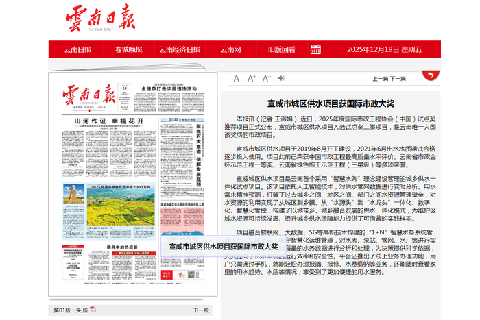 《云南日報》頭版:宣威市城區供水項目獲國際市政大獎